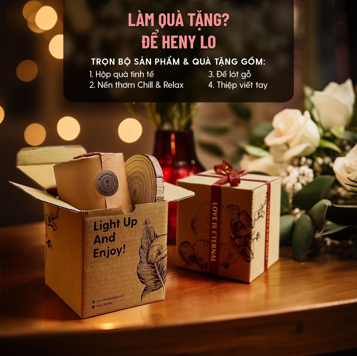 - Tặng kèm: Đế gỗ lót, Thiệp, Hộp, Túi Giấy